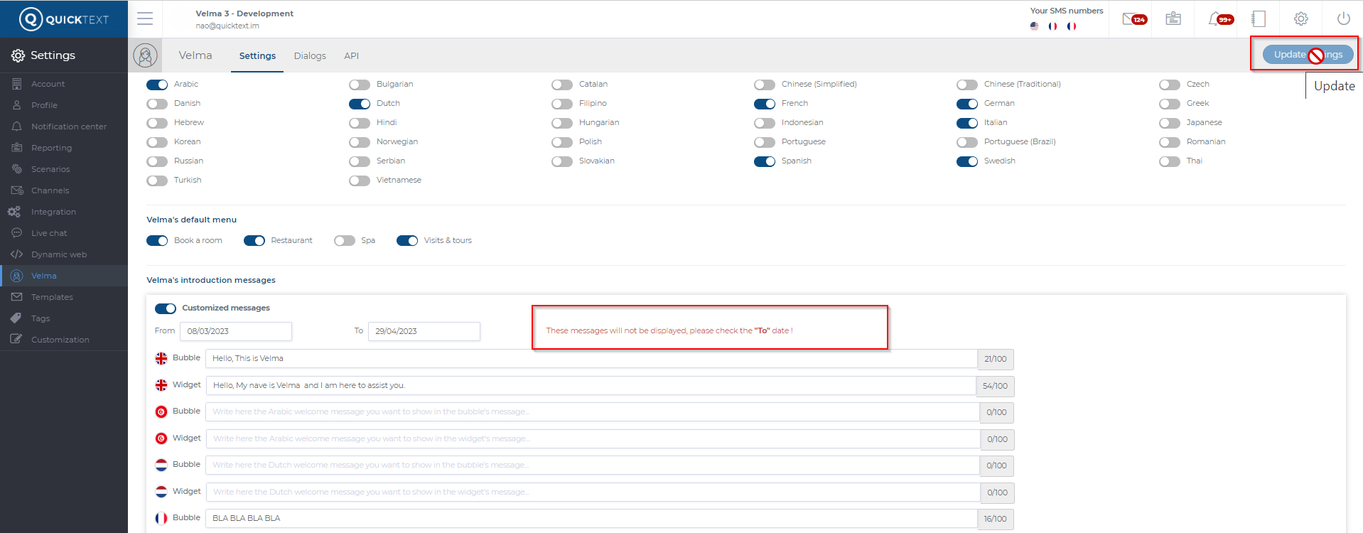 - Go to dashboard > Settings> Velma Settings> Velma's introduction messages