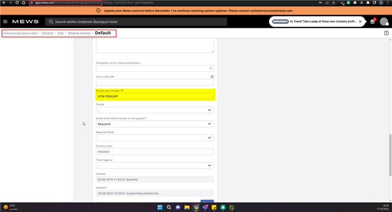 1/ Make sure that the correct Google Tag Management account is associated with the Booking Engine from your Mews Commander (PMS).