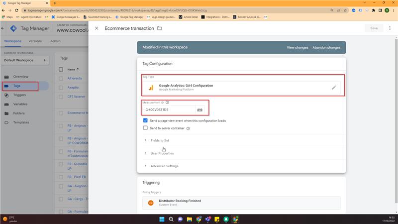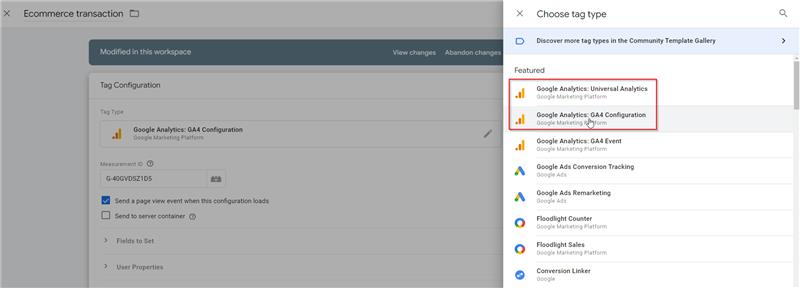 3/ To set up the customer's Analytics account correctly, you need to change the Ecommerce Transaction Tag to Google Analytics GA4 configuration