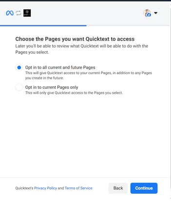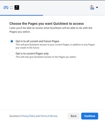 - Opt in to all current and future Pages. Click Continue.
