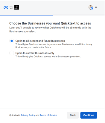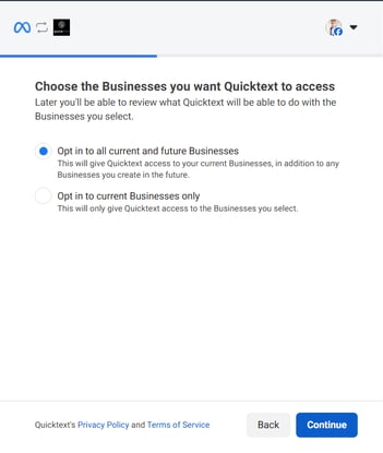 - Opt in to all current and future Businesses. Click Continue.