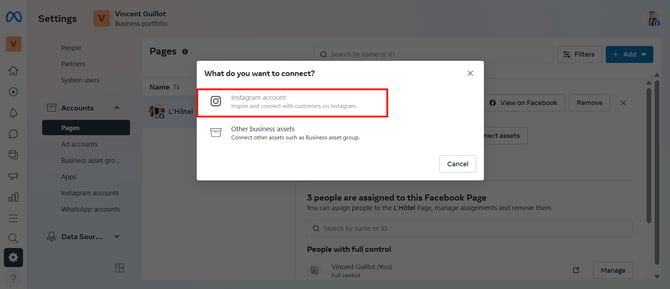 - On the right panel, select your establishment and connect. You will notice that the name that is appearing is related to your Facebook page associated with your Instagram account