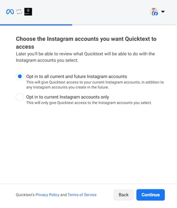 - Opt in to all current and future Instagram accounts. Click Continue.