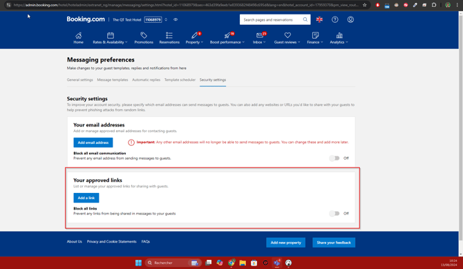 - Please ensure that your clients authorize the use of links within Q-Data, so that these links can be shared in conversations on Booking.com (ex: links in more info section, links in the custom answers,...) otherwise, no link will appear in the conversations.
