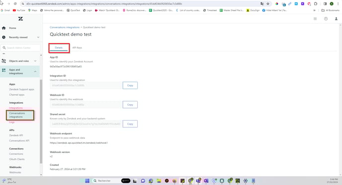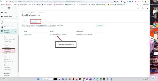Once the the conversation integration and the API key created all tokens axept for the scret key should show on Zendesk